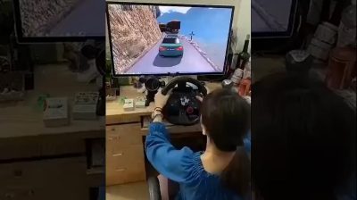 A woman drives a car in a video game, and tries to pass between two trucks on a narrow street. The horn is her only weapon.
