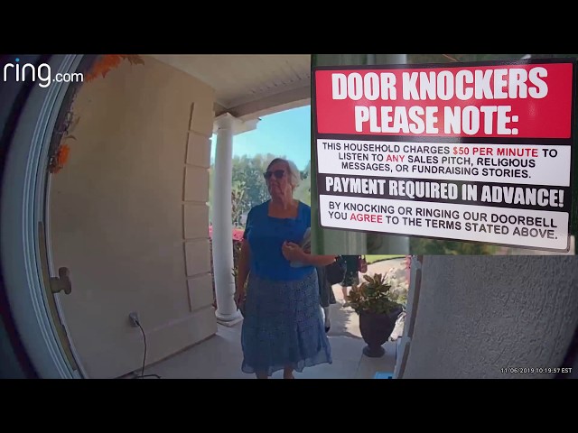 You are regularly disturbed by sellers who come ringing your doorbell. Here is a sign that should deter them. The sign reads: “Direct sellers, please note: The occupant charges $ 50 per minute to listen to speeches from vendors, clerics, or fundraisers. Payment is made in advance. By knocking or ringing the doorbell, you agree to the above terms. “. In the video, 3 people are about to do the canvassing, but after reading the sign, they turn around.