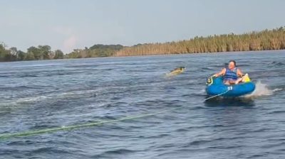 A man receives a sudden visit from a fish while lying on an inflatable armchair on the surface of a lake.