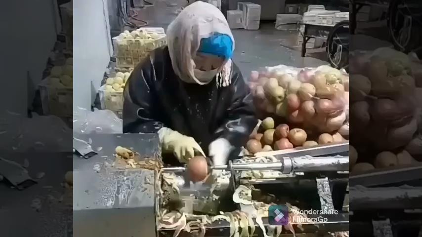 In a factory, a woman peels apples with the help of a machine that rotates them at speed.