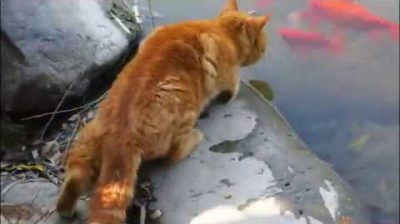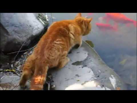 On a lake in Shanghai, China, a cat is waiting to catch goldfish.