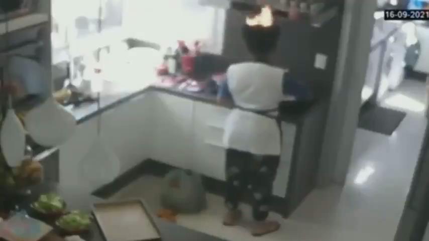 A woman's hair catches fire as she cooks in the kitchen. It will be several seconds before he realizes what has happened.