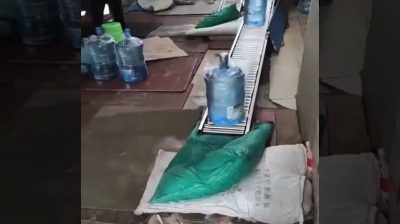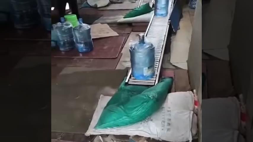 Water tanks are loaded directly on the back of a truck with an improvised construction.