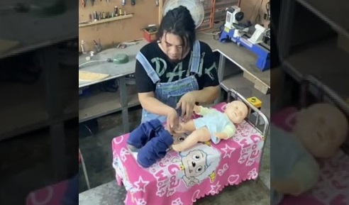 Handy Geng from China shows us his new invention, which uses centrifugal force to automatically wear a baby's pants.