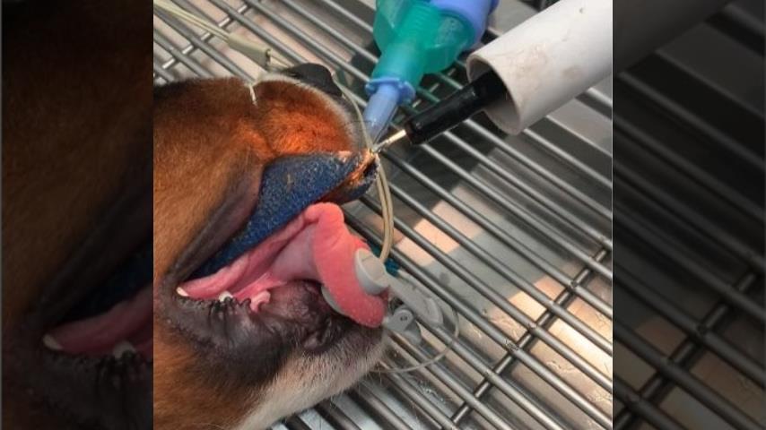 In Bucaramanga, Colombia, a veterinarian removes a leash from the mouth of a dog who had a bad idea to make it his meal.