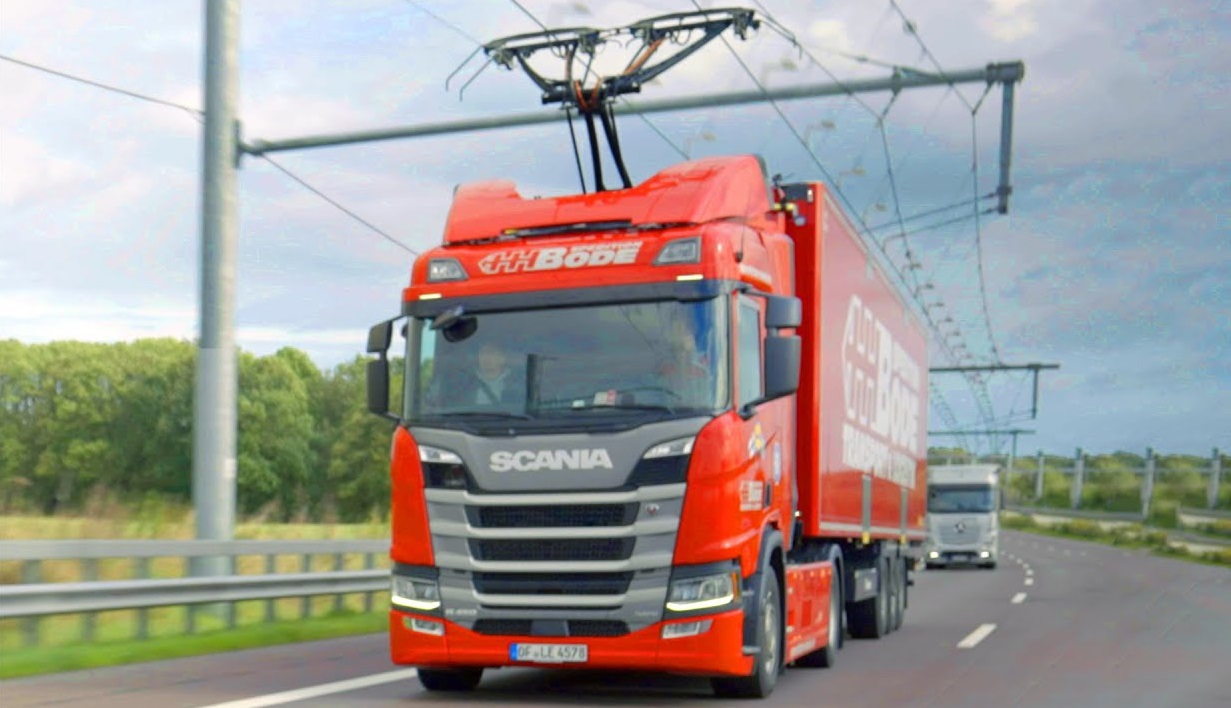 In Lübeck, Germany, there is one of the many pilot projects called eHighway: aerial chain cables, where electric trucks with pantographs can draw power directly from the mains.