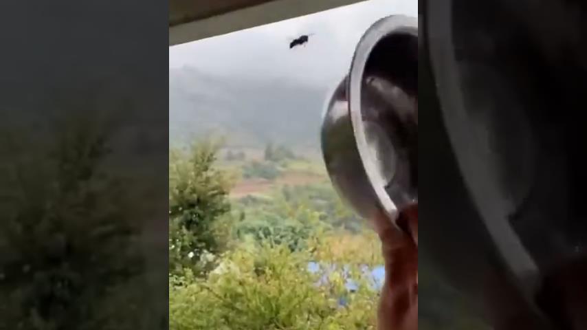 Someone is attacking the wasps that have reached his window, hitting them with a metal bowl.