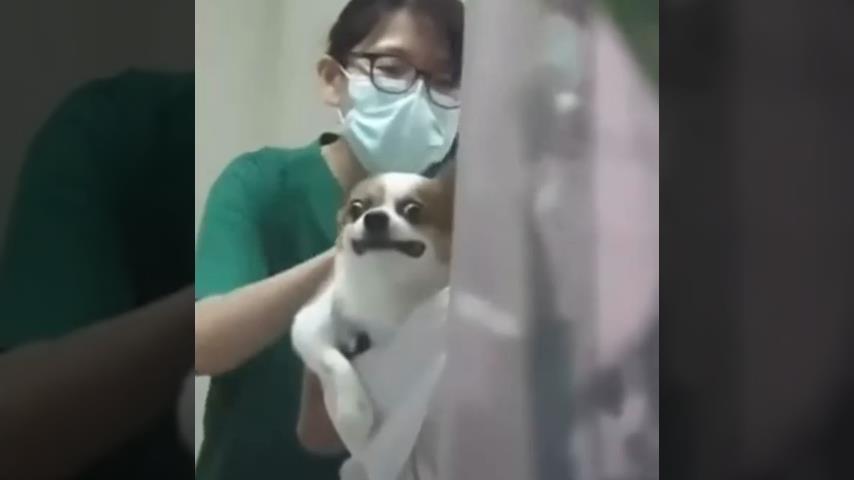 The funny style of a terrified dog, as a veterinarian prepares to give him a vaccine.