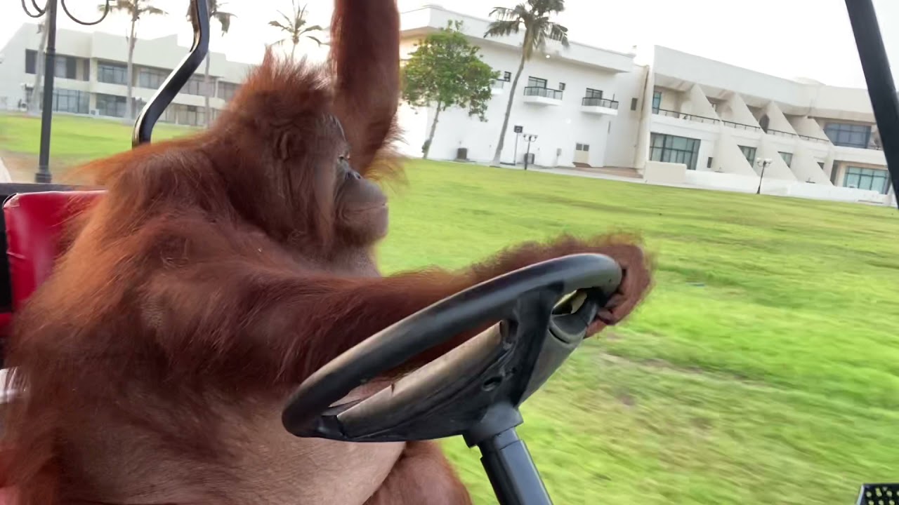In Dubai in the United Arab Emirates, an orangutan rides a golf cart. Rambo, a female orangutan, belongs to Fatima bint Mubarak Al Ketbi, widow of Zayed bin Sultan Al Nahyan, founder of the federation of the United Arab Emirates.