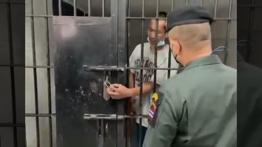 In a detention center in Thailand, a prisoner shows a police officer how easily he can open the lock of his cell.