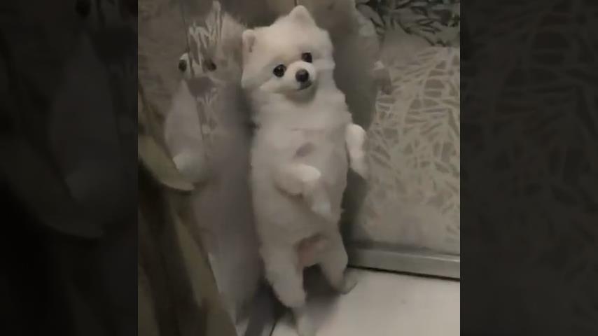 A small dog looks scared inside an elevator full of people, but as soon as the doors open he comes out and suddenly starts barking in front of them.