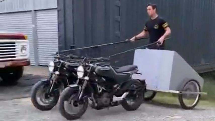 An engineer had the idea to build a Roman chariot that moves on motorcycles instead of horses. With two long pipes, the driver can control the throttle remotely.