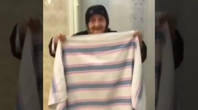 A grandmother disappears behind a sheet. If you watch the video very carefully, you will understand that it is just a juggling trick.