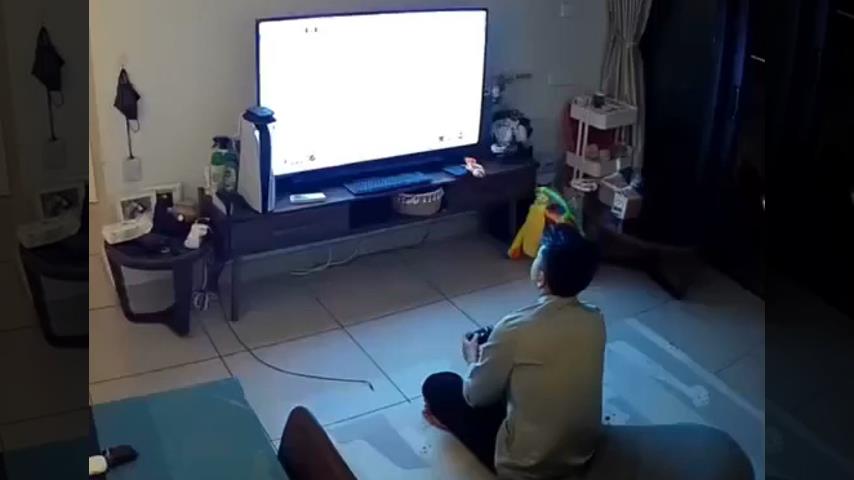 A man was playing a video game in front of his television, when he got upset and threw the controller on the ground. This bounced on a mat and broke the TV screen.
