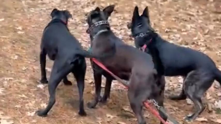 One of these 4 dogs is extremely lazy, and stays constantly behind the others during a walk in the woods.