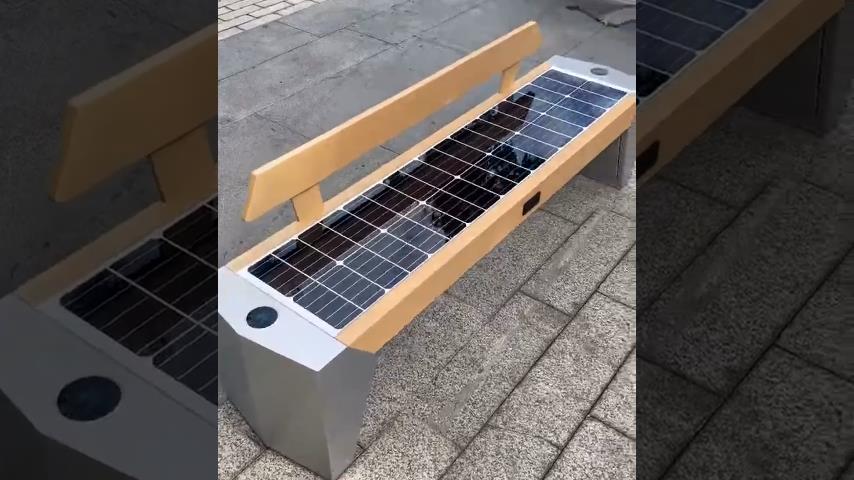 A bench in a city park with solar panels, which has an induction charger for mobile phones.