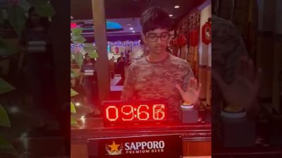 A young man tries his luck at a fun game in a bar. If he manages to stop the timer at exactly 10 seconds, then he wins a beer.