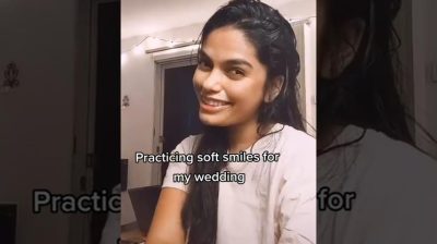A woman shows how discreetly she would like to smile at her wedding, and what actually happened.