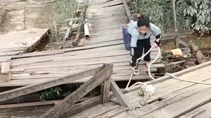 The owner of a barge in Indonesia shows us how she moors her boat to a pier.