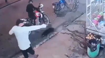 On a street in Brazil, two thieves approach a canteen and ask the owner of a motorcycle to give them the keys. The moment they try to escape on the motorcycle, a patrol car approaches them and three police officers stop them.
