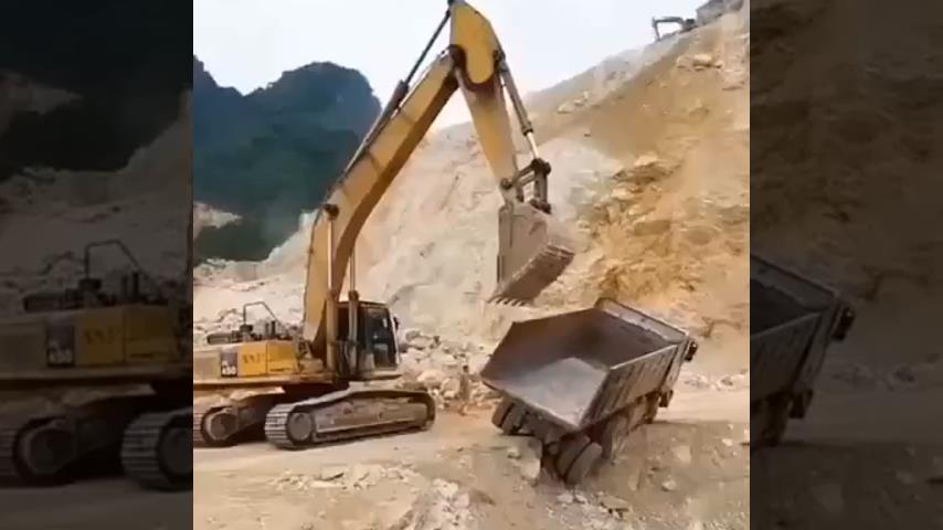 In a quarry, an excavator helps to restore a truck that is in danger of overturning.
