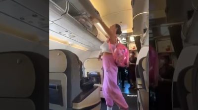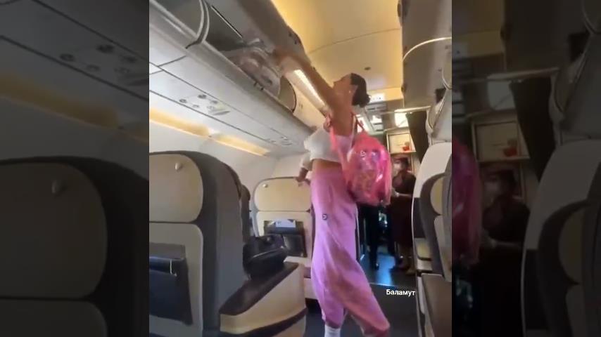 A man tries to copy a woman, who closes the luggage locker of an airplane with her foot.
