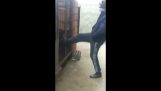 On a pedestrian street, a man tries to kick a dog and gets his lesson.