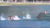 A swimmer makes a spectacular dive as he exits a large water slide.