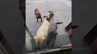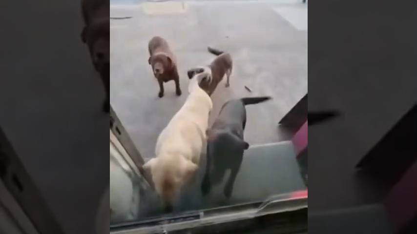In a pet shop in Argentina, four dogs arrive daily to collect their presents from the shopkeeper.