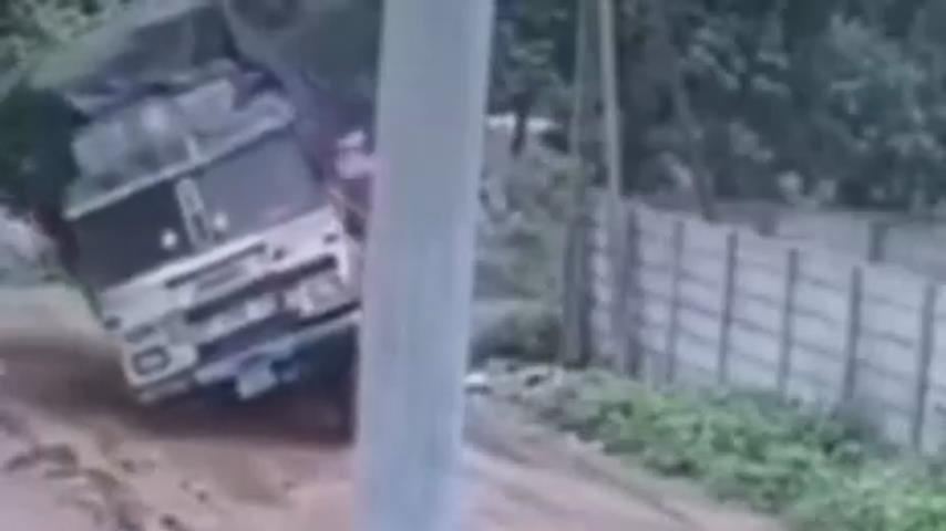A truck overturns under its own weight, and the bucket together with the cab detach from the chassis. The truck will only continue its route, while the driver climbs out of the wrecked cab to chase after it.