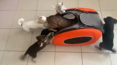 Five chihuahuas pile into a bag and get ready for a bike ride.