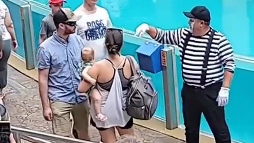 At the SeaWorld park in Orlando, United States, a mime helps a couple share the burden of parenthood.