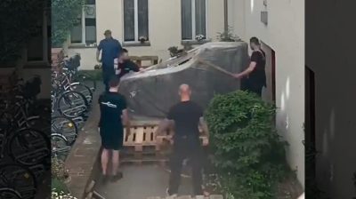 The method of a group of carriers, to raise a grand piano to the first floor of an apartment building.