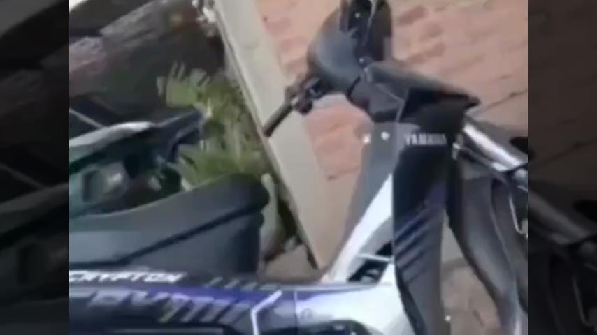 In front of a motorcycle, a parrot imitates the sound of an engine trying to start.