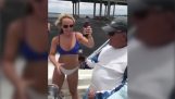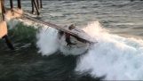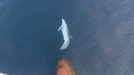 Off Hawaii, a happy dolphin has fun surfing the wave of a ship's bow. A bow wave is a wave formed by the bow of the boat as it moves forward.