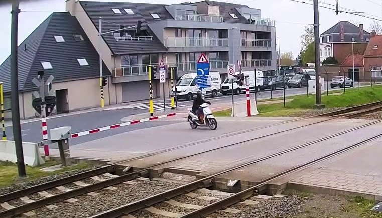 On the morning of Tuesday, April 18, 2023 in Izegem, Belgium, a motorcyclist was nearly hit by a train while crossing a level crossing with lowered bars. The man on the scooter narrowly escaped being hit by the train. The incident caused a 10-hour delay in rail traffic.