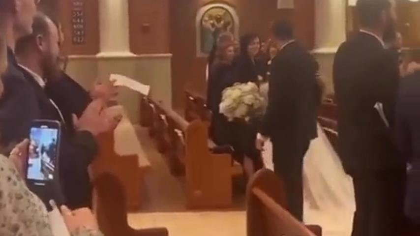 During a wedding a man pretends to take a video with his cell phone, while actually watching a match.