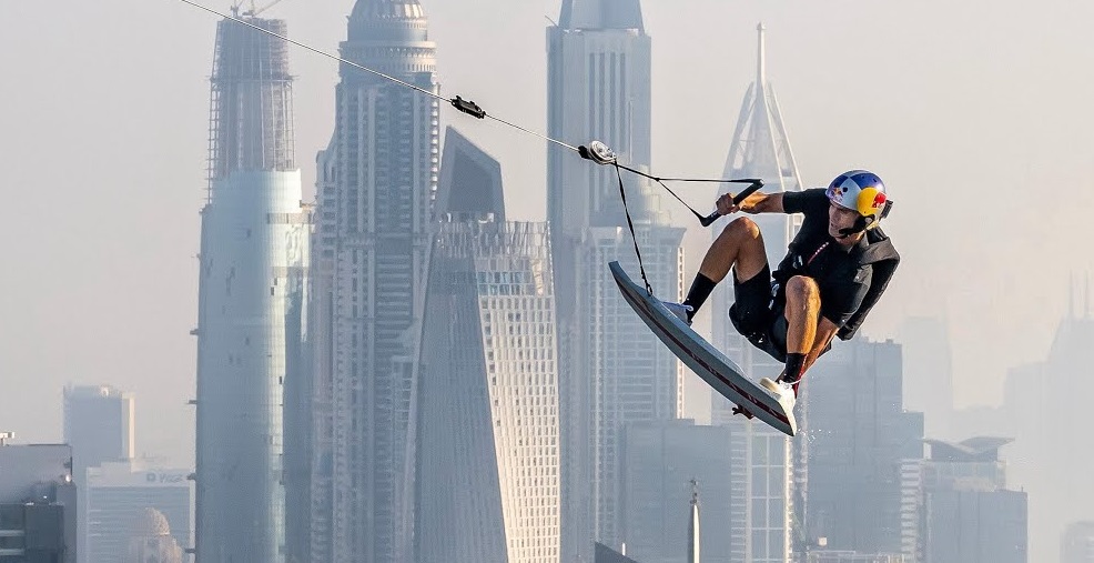 American Brian Grubb combined wakeskating and base jumping to make a dangerous jump in Dubai. Grubb was towed across the water by a large drone, before jumping off the plank and roof of the 77-story “Address Beach Resort” hotel.