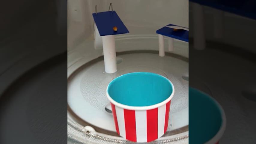 A popcorn diving contest takes place inside a microwave oven. A popcorn pops and the jury gives its score.
