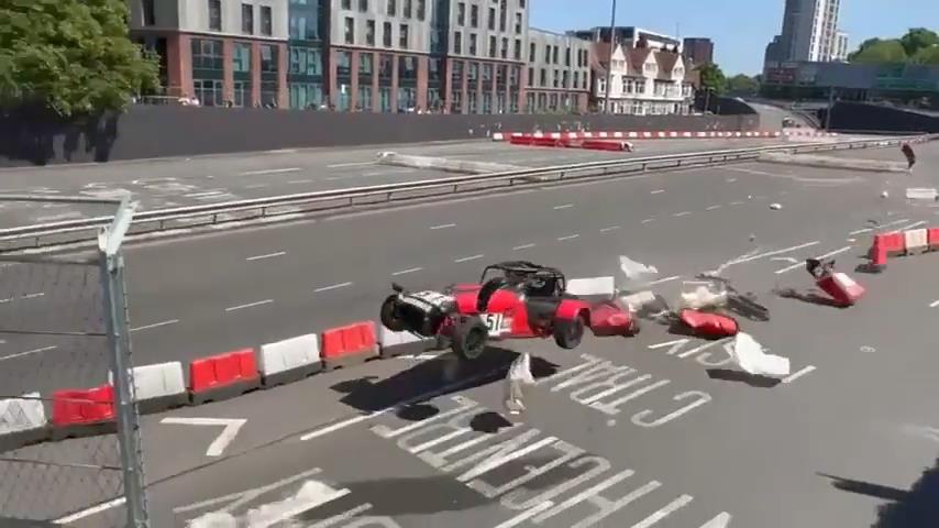 A very lucky man narrowly escapes being hit by an out-of-control racing car.