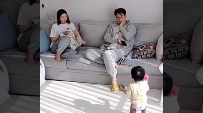 Two parents are very happy, when they see their baby suddenly stand up and take their first steps.