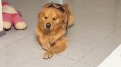 A dog enters the kitchen with secret agent movements, to grab a piece of apple.