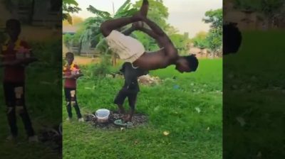 Two men make a spectacular acrobatic where they pretend a dip on the ground with head. But last minute, change direction in their bodies and land safely.