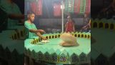 The Chinese acrobat Krystal Liu do a difficult acrobatic 5 bowl and while moving on a monocycle.