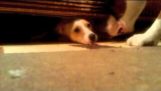 A dog takes care of a baby and cover it with a blanket, to prevent cold.