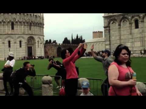 A group of friends trolarei tourists in the Tower of Pisa, the moment they try to take a stand for the very generic 'holding the tower from falling' photo we've all seen.