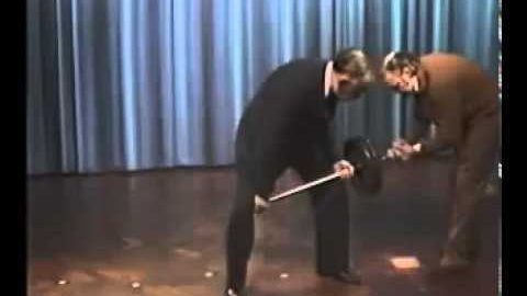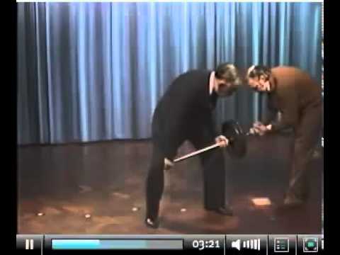 The investigator Eric Laithwaite demonstrates the change in weight with the help of the gyroscopic rotation.