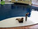A walrus creates some special effects, to take a more impressive photo with a visitor.