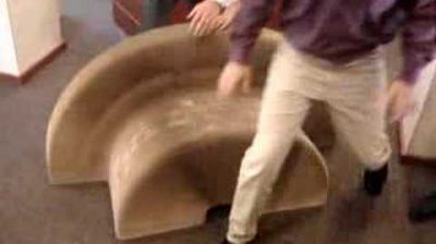 After briefly rising from his desk, an employee sees his chair suddenly launch into the air.