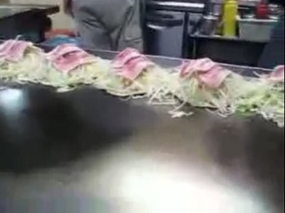 The Okonomiyaki is a roast meal consisting of various materials, mostly pie, cabbage, pork, eggs, Macaroni and others depending on the region served. Here we see the preparation in a Hiroshima restaurant.